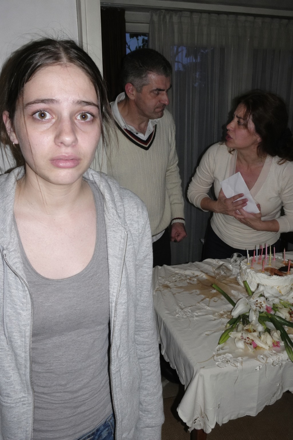 În jurul lor rămăseseră urmele cinei festive: șampania neterminată, o felie de tort cu cincisprezece lumânări, un buchet de crini într-o vază înaltă. Casa lor de la marginea orașului, cumpărată cu cinci ani în urmă, părea dintr-odată străină și rece, deși afară era o căldură sufocantă.