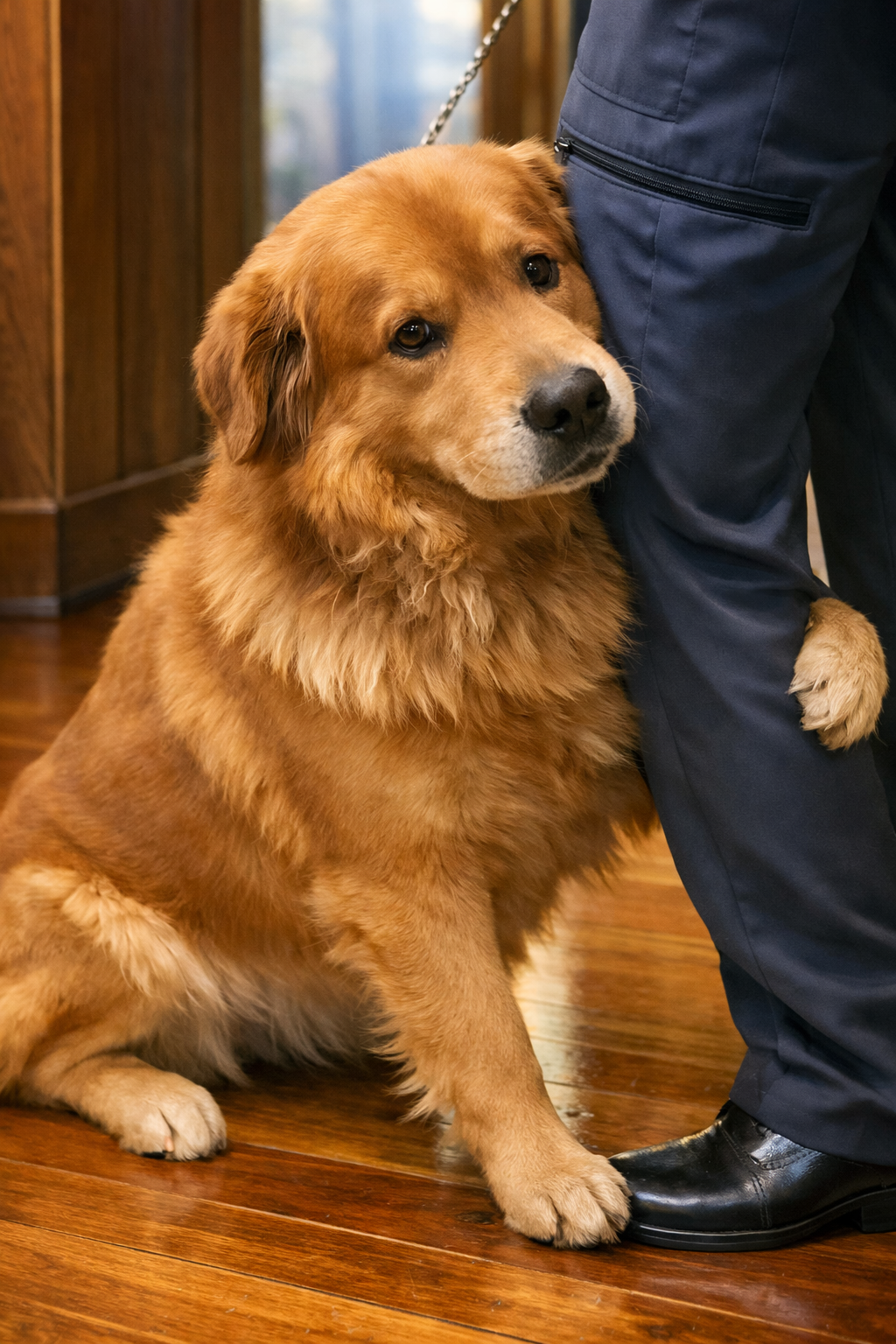 Câinele se comporta impecabil — liniștit și calm, așa cum se cuvine unui asistent dresat.
