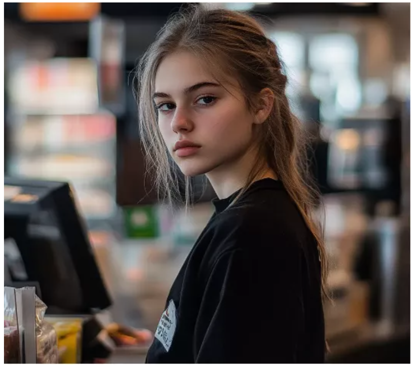 Înainte să apuc să răspund, mi-a atras atenția o mișcare lângă raftul cu sandvișuri. O siluetă mică, îmbrăcată într-o haină fără mărime, stătea acolo, cu capul aplecat și degetele strânse convulsiv pe lângă corp.