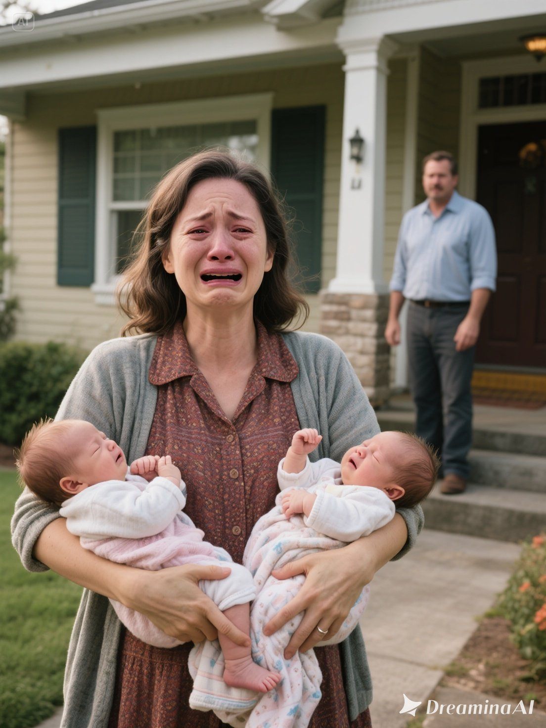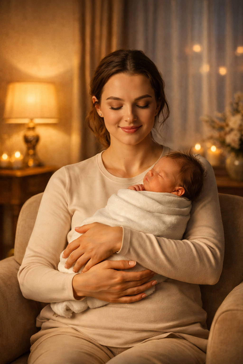 Părul îi era strâns într-un coc neîngrijit, câteva șuvițe lipindu-se de obraz. În brațele ei — înfășurat într-o pătură maro decolorată — se afla un nou-născut.