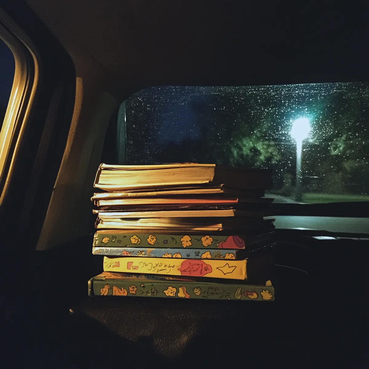 M-a privit, apoi s-a întins spre bancheta din spate, scoțând o mică grămadă de cărți și un dispozitiv de înregistrare.