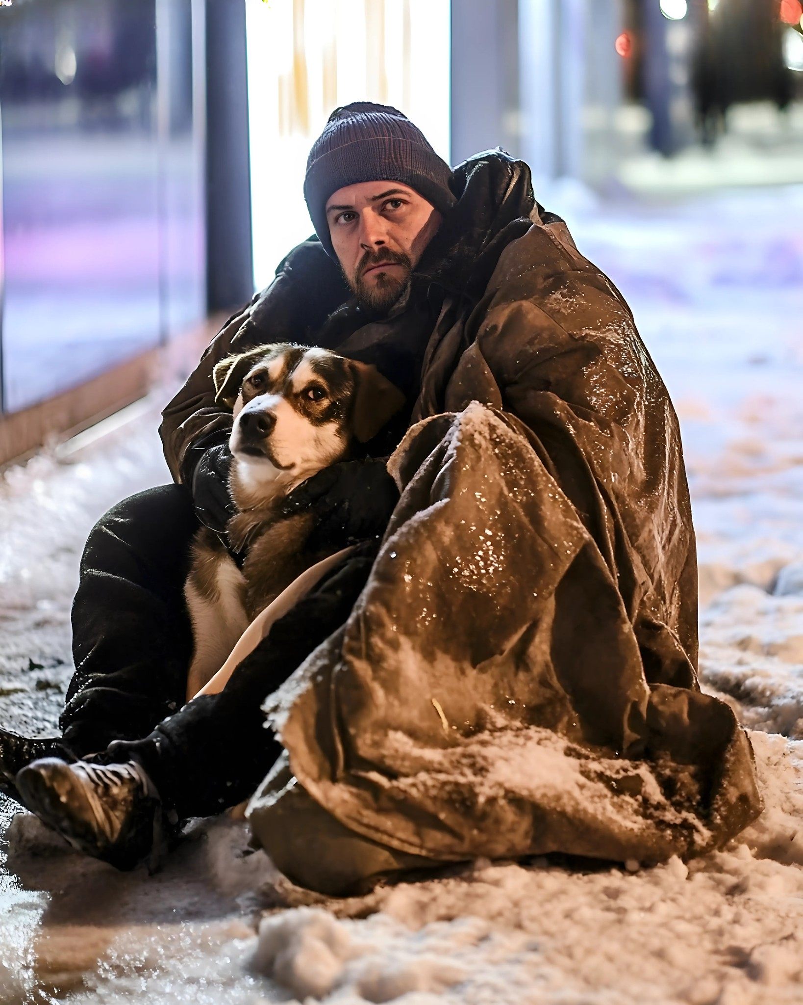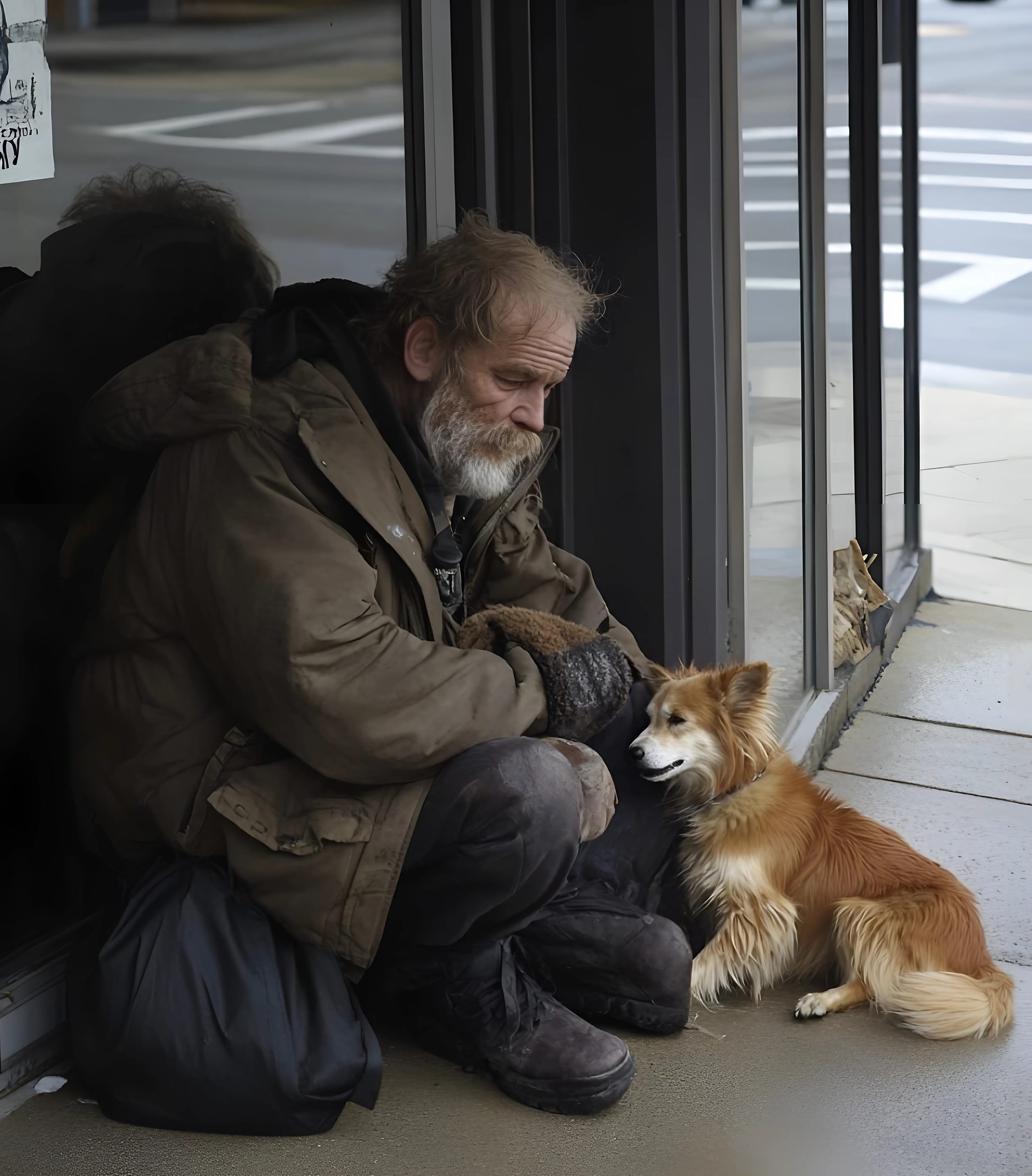 Era înfășurat într-o pătură uzată, iar fața îi era roșie de frig. Lângă el stătea un câine mic și zburlit, tremurând și lipit de el.